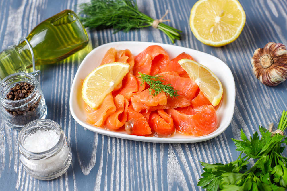 - Красная рыба: Филе лосося или форели, присыпанное смесью соли и сахара в пропорции 2:1, подарит уникальный вкус. Добавление свежемолотого перца и цитрусовой цедры создаст пикантные нотки.