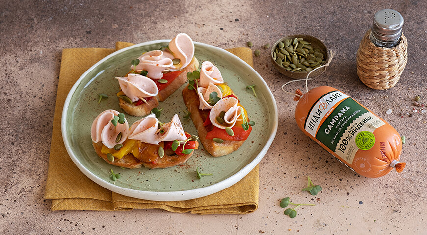 3. Ломтики чиабатты подрумяньте на сковороде с обеих сторон, затем переложите их на сервировочную тарелку. На каждый кусочек уложите запеченный перец, сбрызните чесночно-масляной смесью. Завершите оформление, добавив ломтики ветчины и щедро посыпав тыквенными семечками. Эти закуски лучше всего подавать сразу же после подготовки, пишет Дзен-канал "ГАСТРОНОМ.РУ".