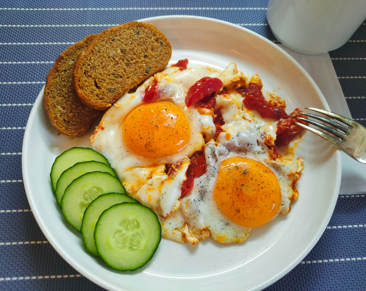 На утро подается яичница с помидорами, сладким перцем и свежим огурцом, а также цельнозерновой домашний хлеб и ароматный кофе. Черная соль добавляет оригинальный акцент, предотвращая nguy, связанный с пересолением.