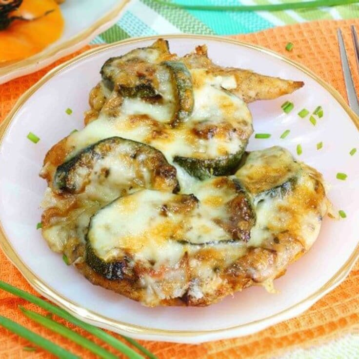 В форму для запекания укладывают слоями кабачки и курицу, каждый слой посыпая тертым сыром.