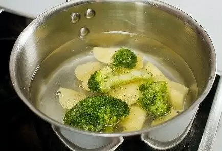 1. Подготовка овощей. В небольшой кастрюле довести до кипения подсоленную воду. Положить очищенный и нарезанный картофель, варить около десяти минут. Затем добавить брокколи и продолжать готовить до мягкости.