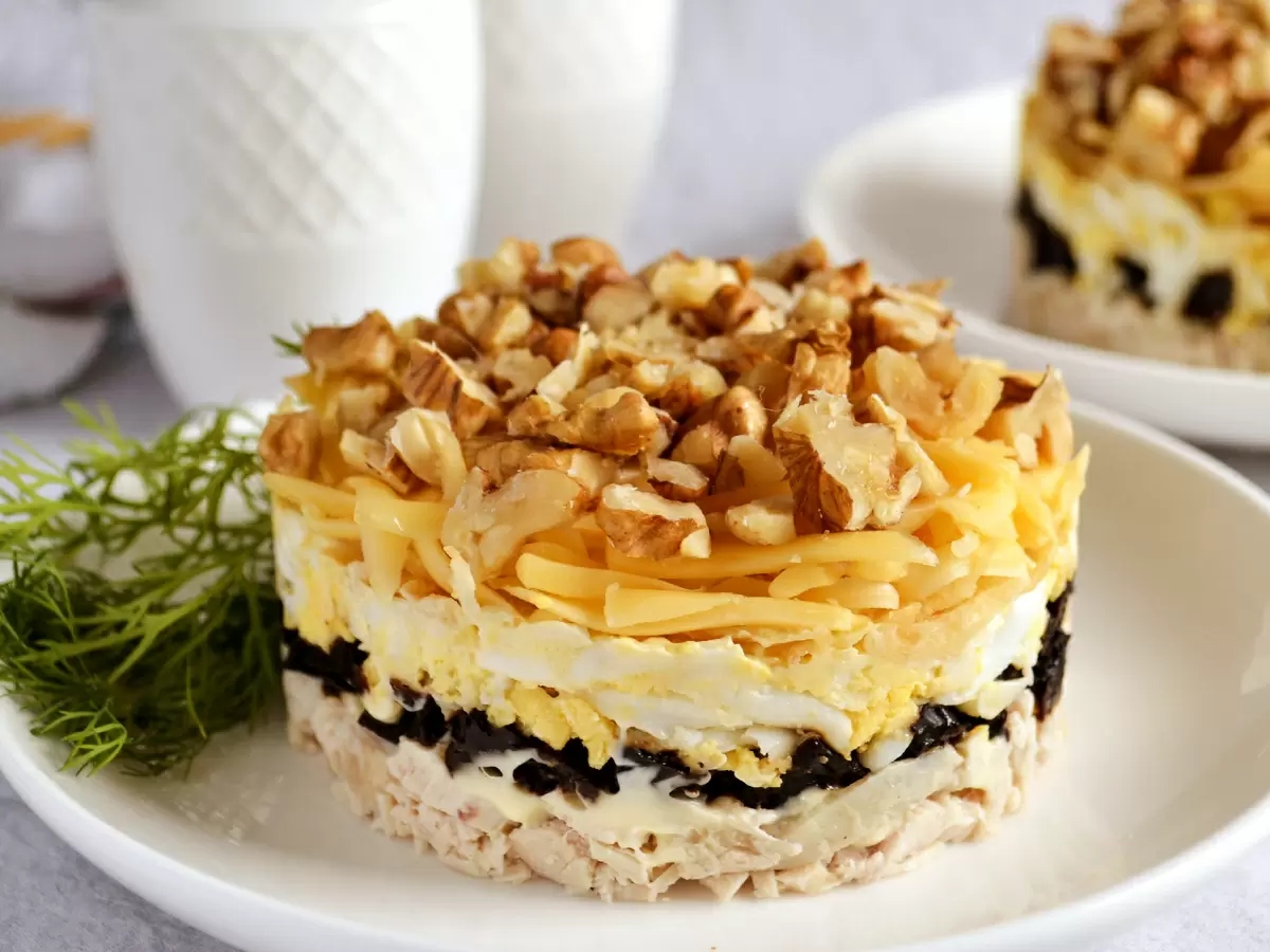 Этот салат поистине волшебный и идеально подходит для любого праздника! Нежная курица, сладкий чернослив, хрустящие яблоки и орехи образуют гармоничное и вкусное сочетание. Такой шедевр всегда пользуется популярностью у гостей. Главное, дать ему время, чтобы все ингредиенты как следует пропитались.