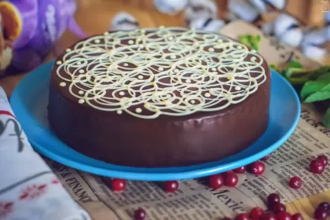 Шоколад растопить на водяной бане или в микроволновке, добавить растительное масло и тщательно перемешать. Готовую массу вылить на охлажденный торт и отправить в холодильник примерно на полчаса.