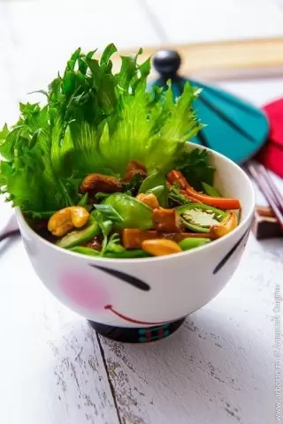 Когда тофу впитает все ароматы, пора обжаривать его с овощами. На горячую сковороду с растительным маслом выкладываются нарезанные овощи: морковь, брокколи и другие зеленые овощи по вашему вкусу. Обжаривайте смесь до мягкости, затем добавьте замаринованный тофу и кешью, продолжая жарить еще несколько минут, пока все ингредиенты не объединятся в ароматное блюдо. Можно украсить готовое блюдо свежей кинзой и зеленым луком.