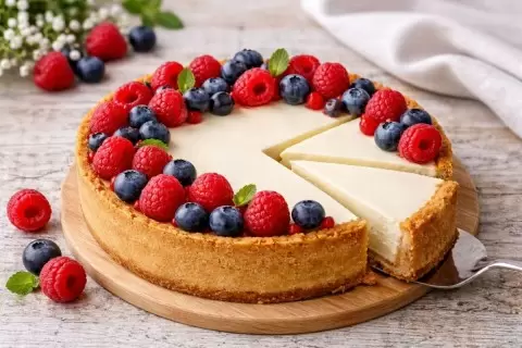 Приготовление чизкейка не потребует особых кулинарных навыков, а результат станет настоящим украшением как праздничного стола, так и вечеринки для близких. Украсив чизкейк свежими ягодами — малиной и голубикой, вы добавите ярких акцентов и легкой фруктовой свежести, что сделает десерт еще более аппетитным и привлекательным.