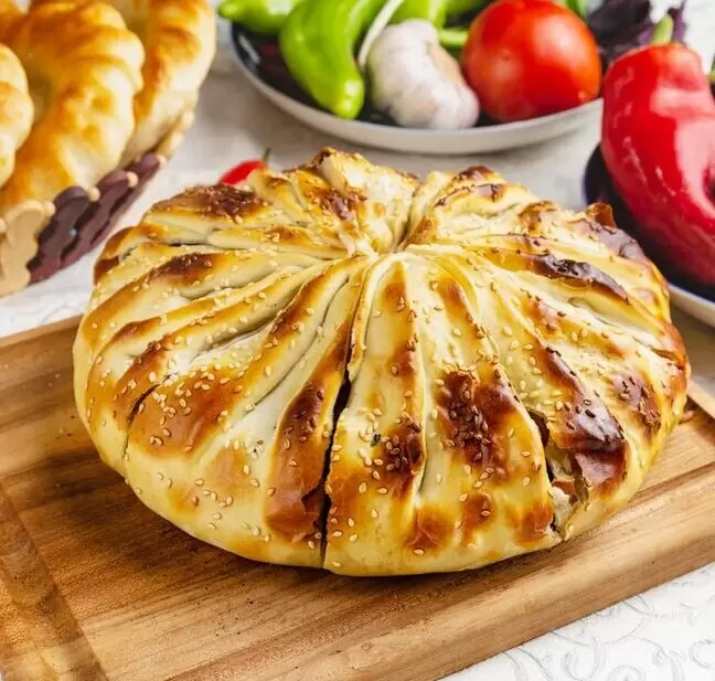Формирование: Раскатайте тесто в пласт толщиной 3 мм. Выложите его в форму. Заполните пловом, добавьте оружие и аккуратно защипните края.