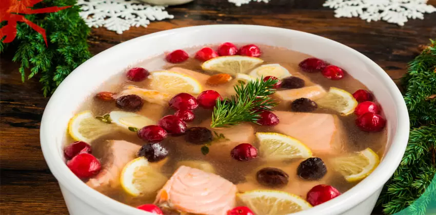 Теперь займитесь желатином: замочите его в теплой воде на 5-6 минут, затем растворите в горячем бульоне. В форму для заливного выложите кусочки рыбного филе, перепелиные яйца, лимон, клюкву, изюм и миндаль. Залейте все получившимся бульоном, дайте остыть, а затем поместите в холодильник минимум на 5-6 часов. Ваше заливное готово, и оно станет изюминкой любого праздничного стола!