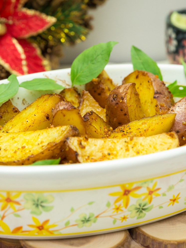4. Разогрейте духовку до 200 градусов и отправьте картошку запекаться на средний уровень. Готовьте в течение 30-40 минут, но не забывайте проверять: румяная корочка и мягкость внутри — это признаков готовности.