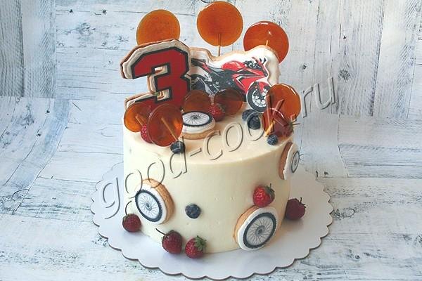 5. Финишная отделка: Взбить сливочное масло с сахаром, добавить сливочный сыр. Обмазать торт сначала черновым слоем, затем выровнять и украсить по желанию.