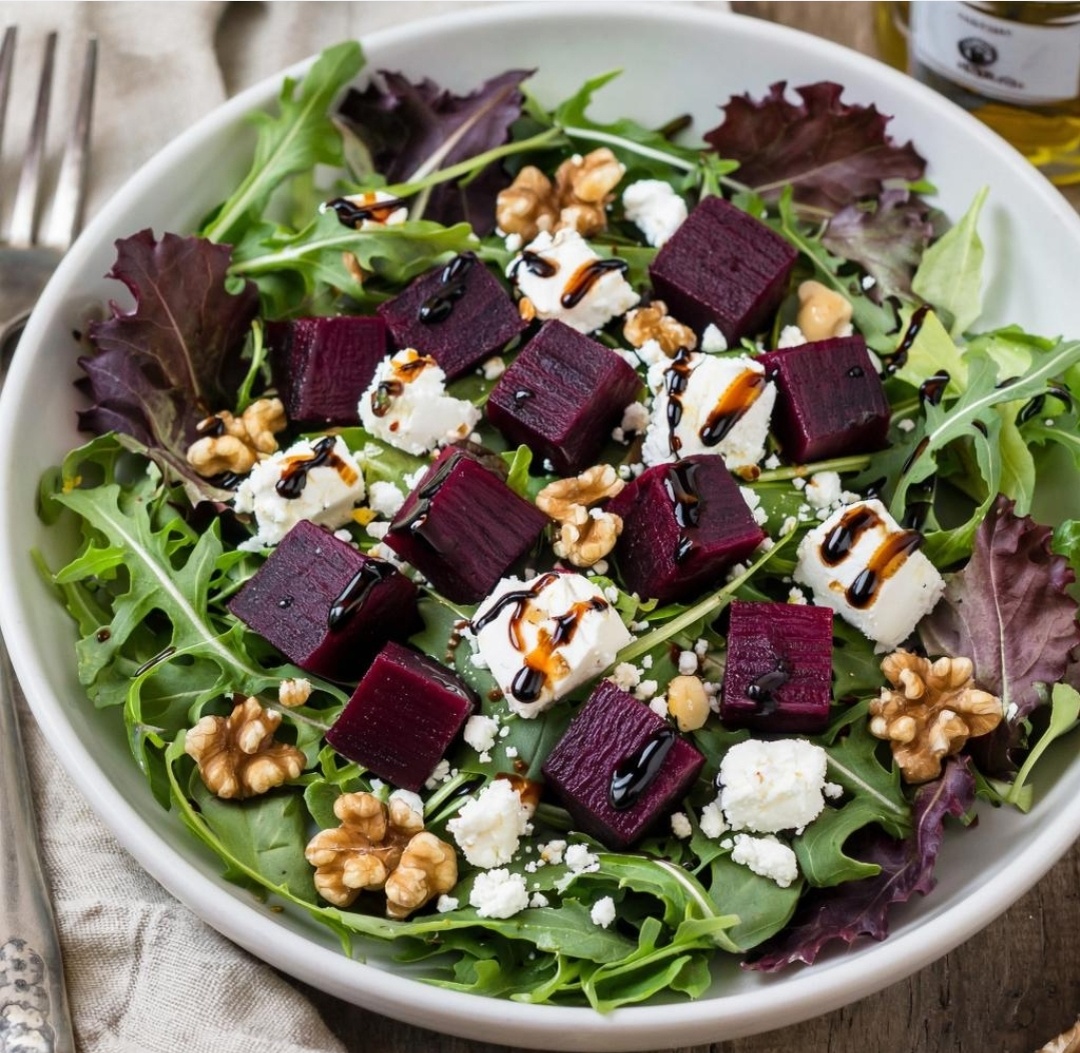 Сочетание сладости печёной свёклы и великолепного козьего сыра создаёт настоящую симфонию вкусов, которая никого не оставляет равнодушным. Хрустящие орехи добавляют изюминку, делая это блюдо идеальным для любого случая. Легкий и изысканный, этот салат станет настоящим украшением вашего стола и порадует даже самых требовательных гурманов.