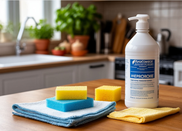 Дезинфекция поверхности: Для дезинфекции столешниц и кухонных принадлежностей нужно смешать одну часть 3% перекиси водорода с равной частью воды. Распылите на поверхности, оставьте на 5-10 минут, а затем протрите чистой тряпкой. Это эффективно уничтожит бактерии и вирусы.