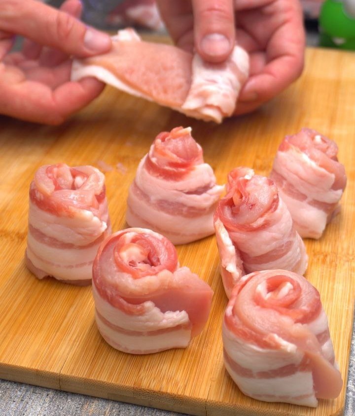 На столе выкладывается скорость бекона, сверху помещается полоска курицы, которую слегка прижимают. Затем всё сворачивается в плотный рулет и надвигается на шампур. Рулетики обмазываются маринадом.