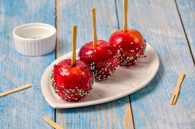 Затем их можно обсыпать кондитерской посыпкой, перед тем как положить на подготовленную тарелку. Когда все яблоки будут готовы, их можно оставить сушиться вверх дном. Для этого отлично подойдет тыква, в которую смеси можно удобно вставить палочки. Через некоторое время карамель затвердеет, и лакомства можно будет перевернуть, пишет Дзен-канал "Рецепты на каждый день".