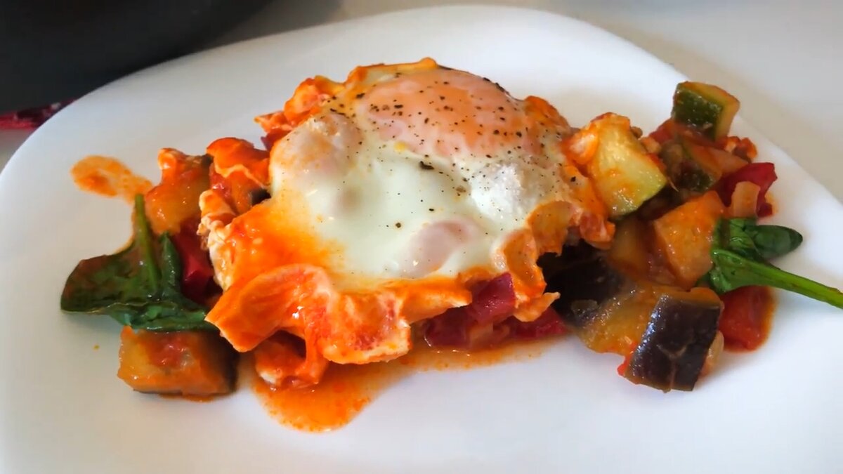 Когда овощи готовы, добавляют томаты из блендера и томатную пасту, затем аккуратно разбивают яйца сверху. Закрывают сковороду крышкой и готовят до состояния, когда белки полностью свернутся, а желтки останутся слегка жидкими.