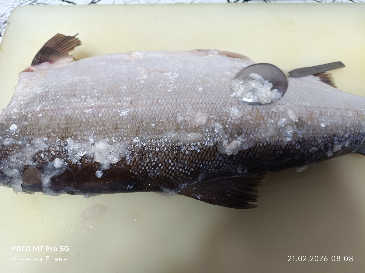 Удаление чешуи происходит с помощью заточенной ложки, которая также подошла для извлечения баклажанов и кабачков в процессе готовки. После чистки рыба тщательно промывается и обсушивается, затем удаляются плавники, а все обрезки идут на уху.