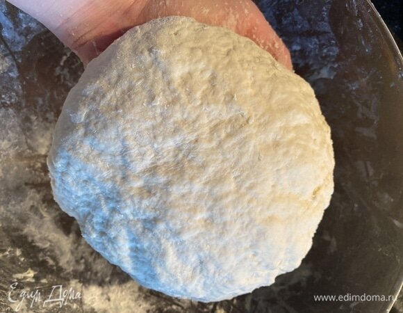 Когда тесто подойдет, разделите его на три части, две из которых накройте пленкой. На рабочую поверхность посыпьте немного муки и приступайте к формированию. На этом этапе 1/3 картофельного пюре соедините с соответствующим количеством сулугуни. Сформируйте шар, который аккуратно помещается в разомнутую лепешку из теста. Сложите края вверх, создавая похожую на хинкали форму, и переверните швом вниз.