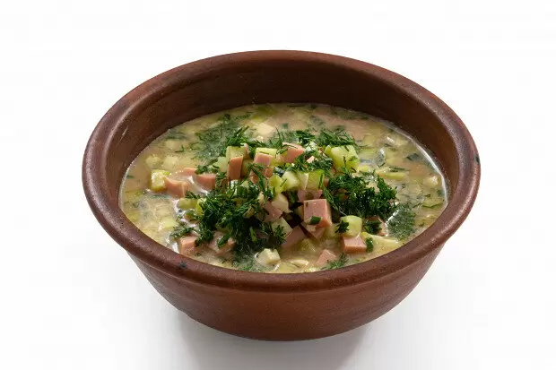 - Окрошка на кефире, классический русский суп с колбасой и свежими овощами, идеально подходит для обеда.