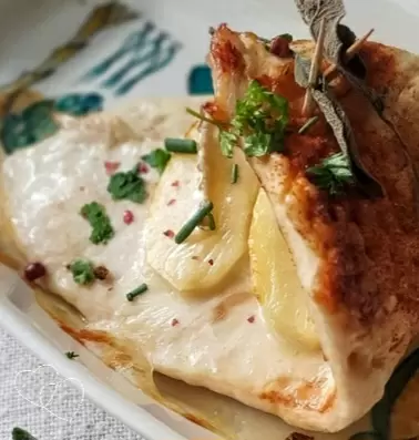 На одну половину отбивной выложите яблоки, рядом разместите сыр и слегка посыпьте паприкой. Затем аккуратно заверните вторую половину мяса с начинкой, используя листик шалфея в качестве «застежки» с помощью зубочистки.