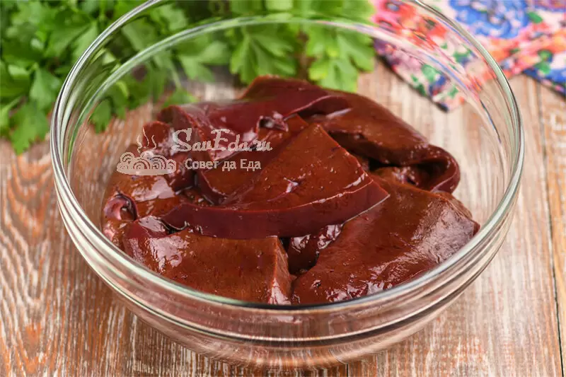 1. В теплой воде растворите 1 столовую ложку соли и 1 столовую ложку сахара на 1 литр воды. Для 800 граммов печени потребуется около 500 мл раствора.