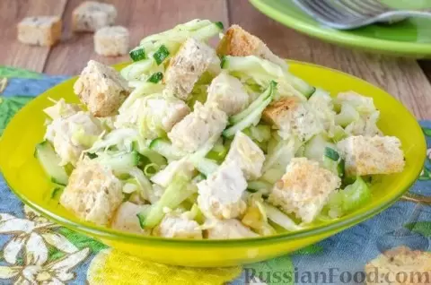 - Салат с курицей и молодой капустой: Легкое и сытное сочетание отварного куриного филе, сочной молоденькой капусты и свежих овощей. Простая заправка из оливкового масла с соевым соусом и горчицей придаст этому блюду невероятный вкус.