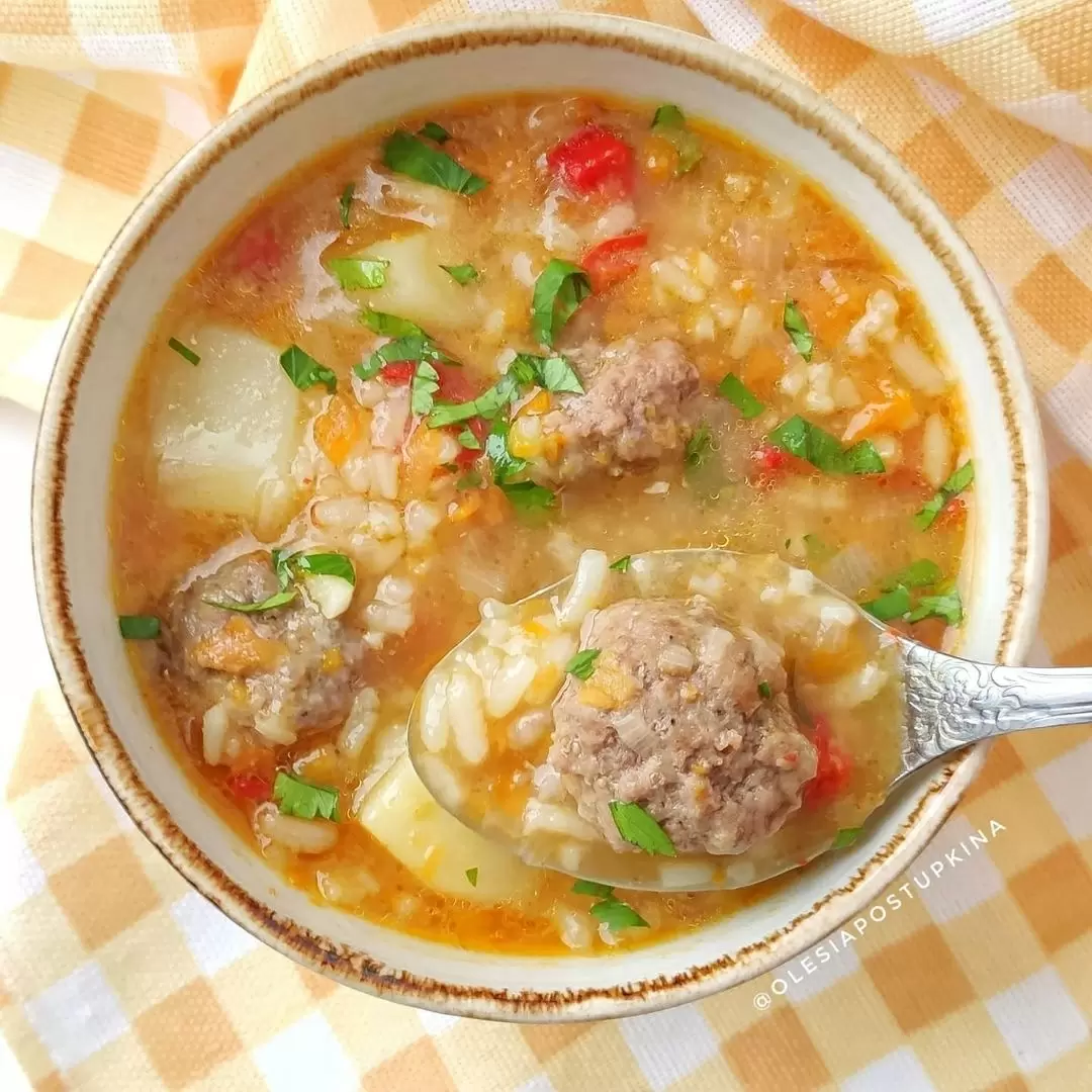 После этого овощную смесь переложить в кастрюлю с готовящимся рисом, добавить фрикадельки и варить еще 15-20 минут. В качестве финального акцента рекомендовано подавать суп с зеленью.