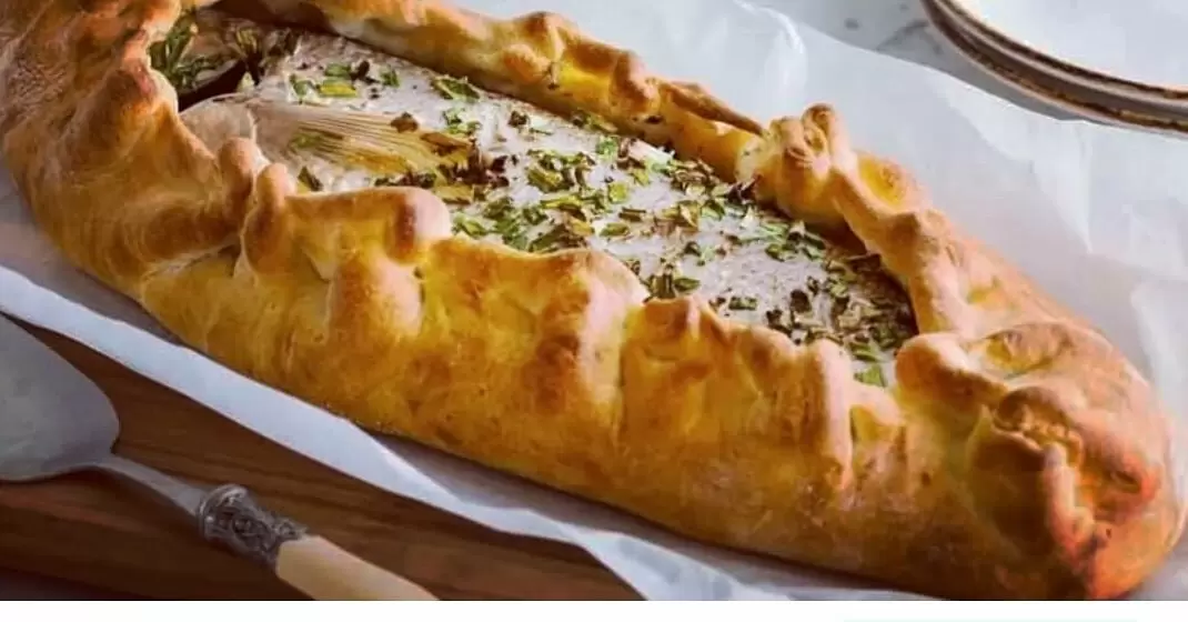 После этого раскатать отдохнувшее тесто в прямоугольный пласт толщиной 0,5-0,7 см. На тесто выложить оставшийся зелёный лук, затем разместить судака. Закрыть рыбу тестом, защипнув края, и сделать проколы вилкой сверху. Выпекать рыбник в заранее разогретой до 180°C духовке в течение 40 минут.