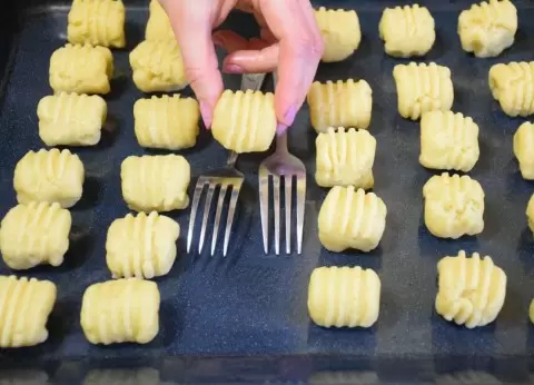 Готовое тесто делим на 30 равных частей, каждый кусочек скатываем в шарик, накрываем пленкой, чтобы оно не сохло, и затем формируем печенье с помощью вилки, как показано в видеорецепте.