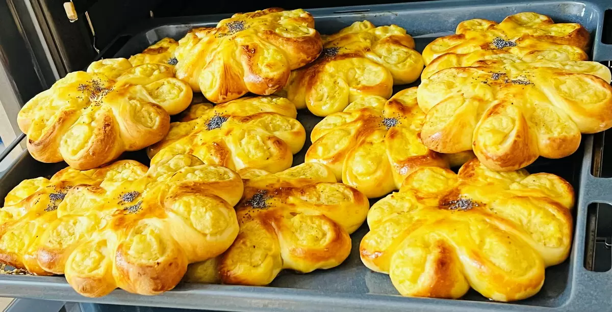Далее тесто делят на 12 равных частей. Каждую часть раскатывают до диаметра 10-12 см, в центр помещают начинку и собирают края в виде мешочка, слегка прижимая их. Затем на каждом «цветке» делают восемь надрезов, что придаст ему красивую форму лепестков.