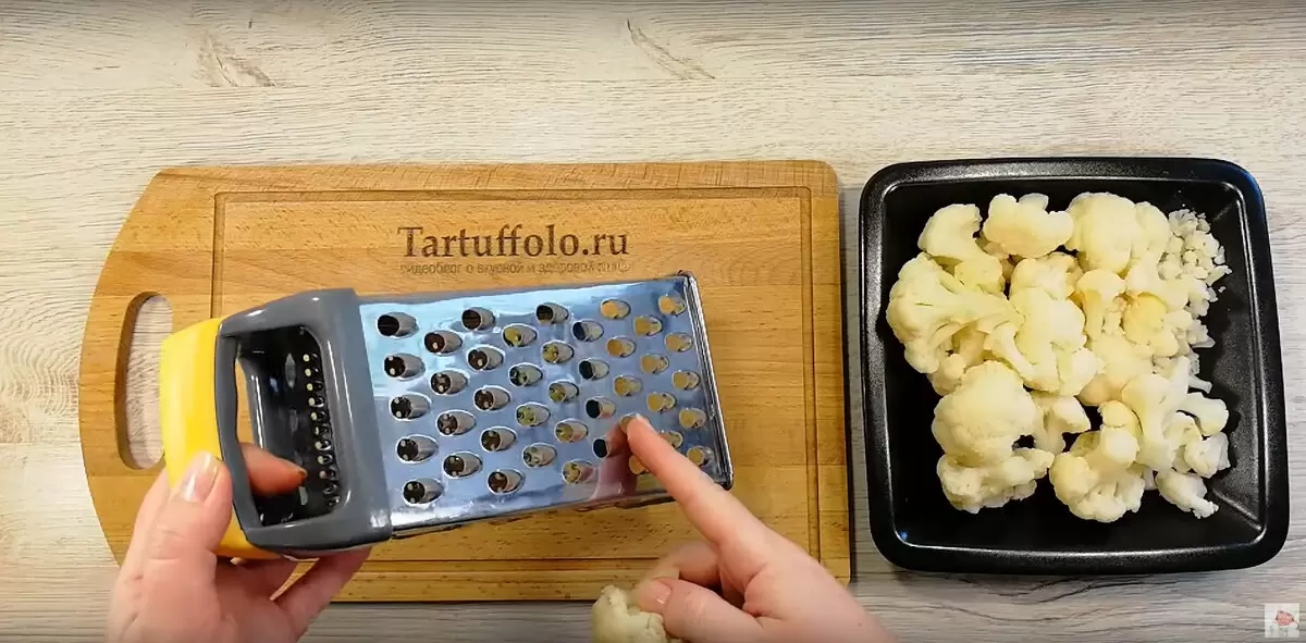 1. Начать следует с подготовки цветной капусты. Замороженная капуста размораживается и натирается на крупной тёрке, после чего перекладывается в большую миску.