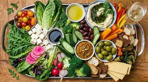 Создайте овощную доску, которая прекрасно дополнит полусухое вино, например, «Наследие мастера «Левъ Голицынъ» белое полусухое. Его фруктовая гармония идеально оттенит свежесть овощей.