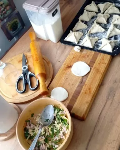 - Слоеные пирожки, которые могут быть как круглой, так и треугольной формы, с начинкой из ветчины и сыра, приправленные зеленью.