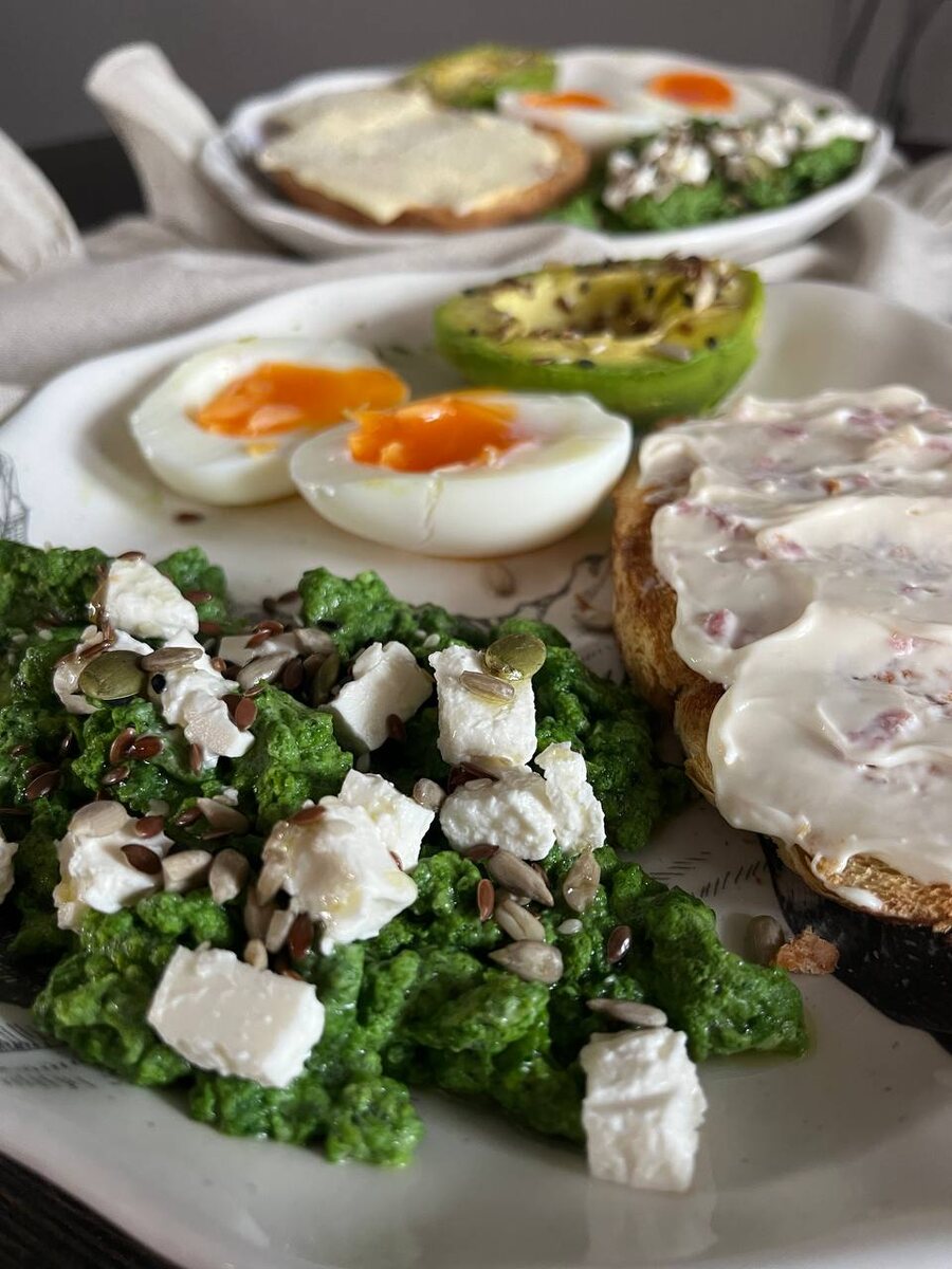 Когда все компоненты готовы, сервируйте омлет, добавьте фету и семена, полейте оливковым маслом, а рядом положите поджаренные тосты, яйца и авокадо. Это не только простой, но также сытный и лёгкий завтрак!