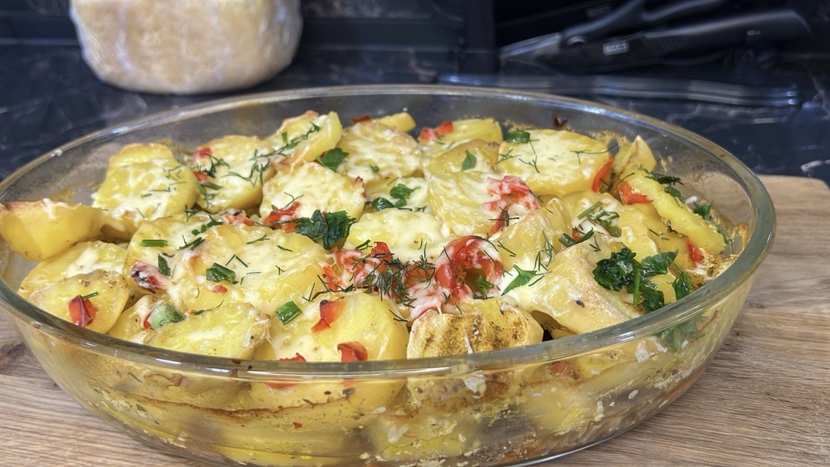 Следующим этапом станет нарезка болгарского перца на кубики, которые также вызывают аппетит и добавляют цветности. Чтобы получить влажную и ароматную начиночку, стоит приготовить заливку: доброю воду смешать со сметаной, добавить соль, специи и немного соевого соуса, а затем тщательно перемешать. Эту заливку равномерно выливают на овощи, покрывают ёмкость фольгой и ставят в разогретую до 170°C духовку на 1 час 30 минут.