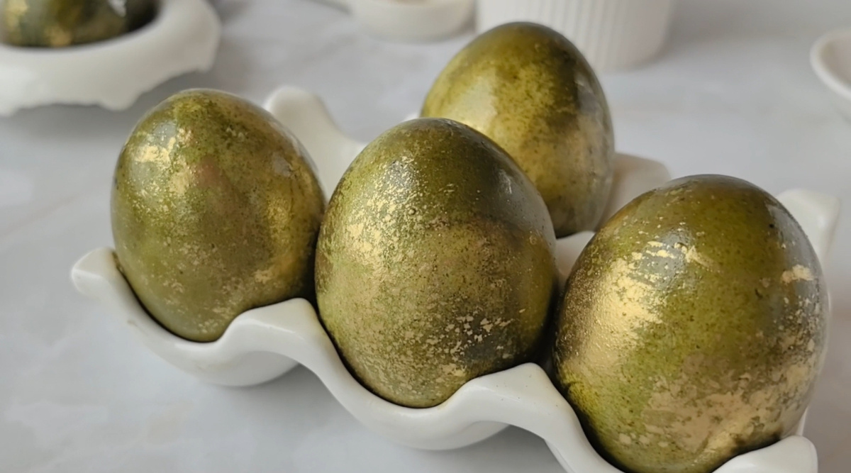 Если предпочитаете матовый эффект, достаточно пропустить этап с маслом. А для создания интересных узоров кандурин можно развести с небольшим количеством спирта и распылить его на яйца.