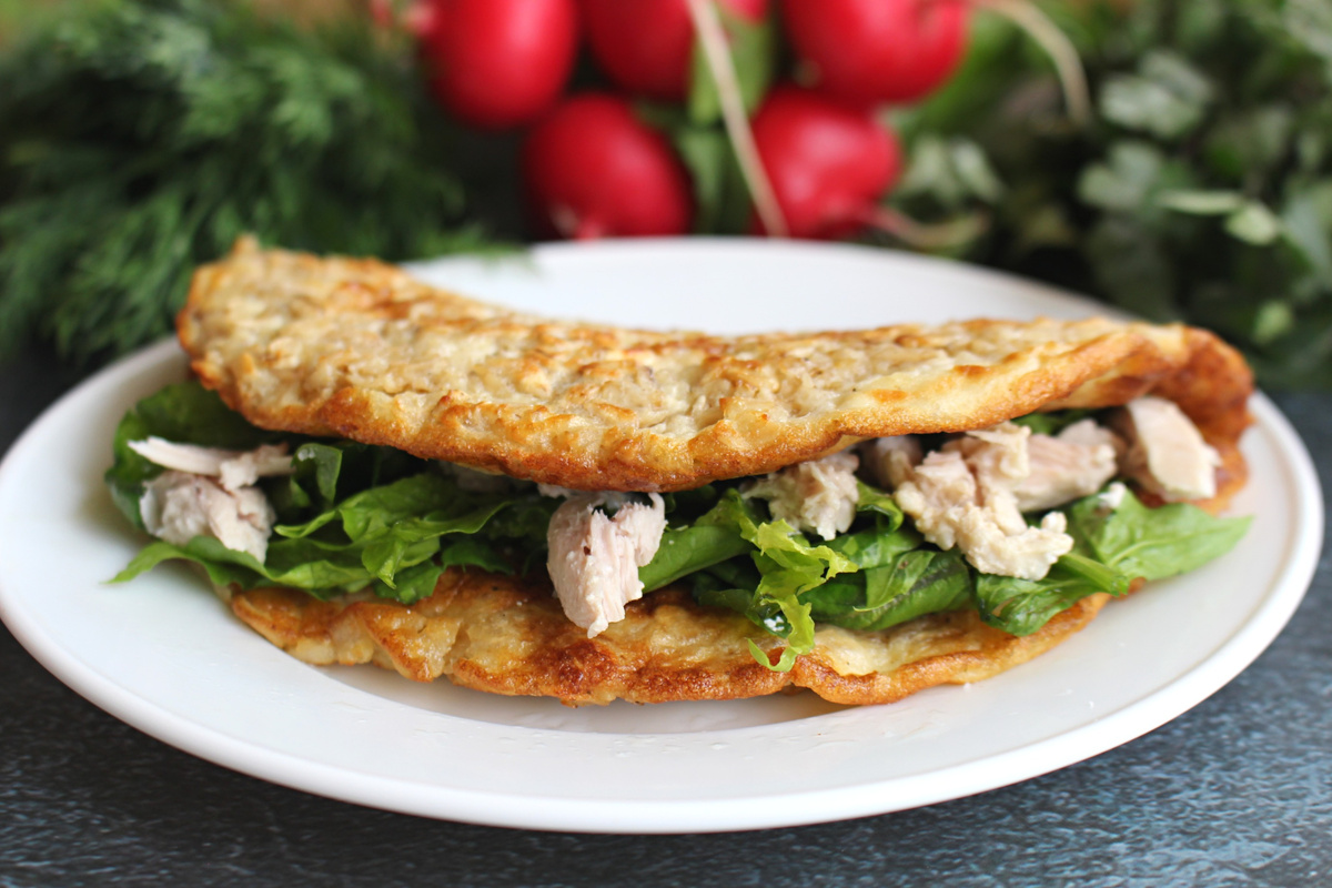 Перевернув блин, продолжить готовить до появления золотистой корочки с другой стороны. Готовый овсяноблин выложить на тарелку и на одну из сторон положить тщательно промытые и обсушенные листья шпината.