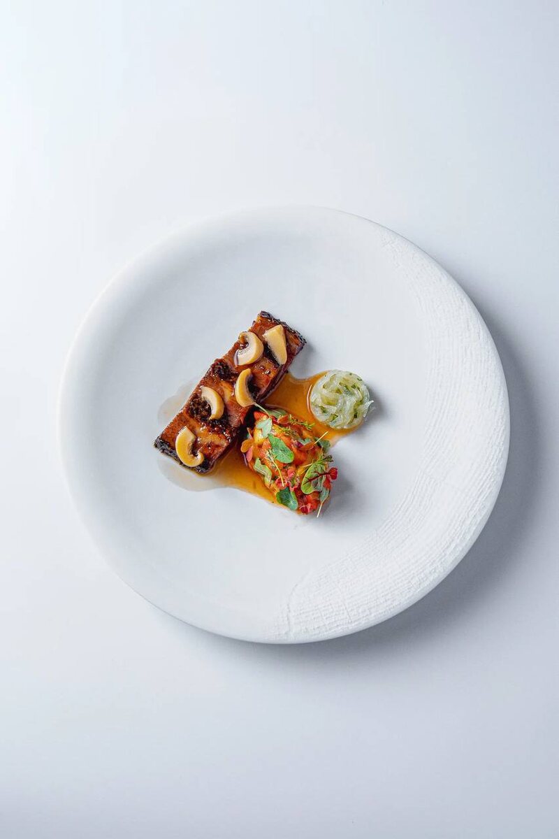 Соус на базе мясного demi-glace с добавлением маринованных груздей обвивает вкусом умами и кусочком кислинки, что лишь усиливает глубину и продолжительность послевкусия. Тем не менее, неожиданный штрих в виде маринованных дынных корочек вместо традиционного лука создавать свежий и хрустящий контраст, уравновешивая плотность и насыщенность рёбер.