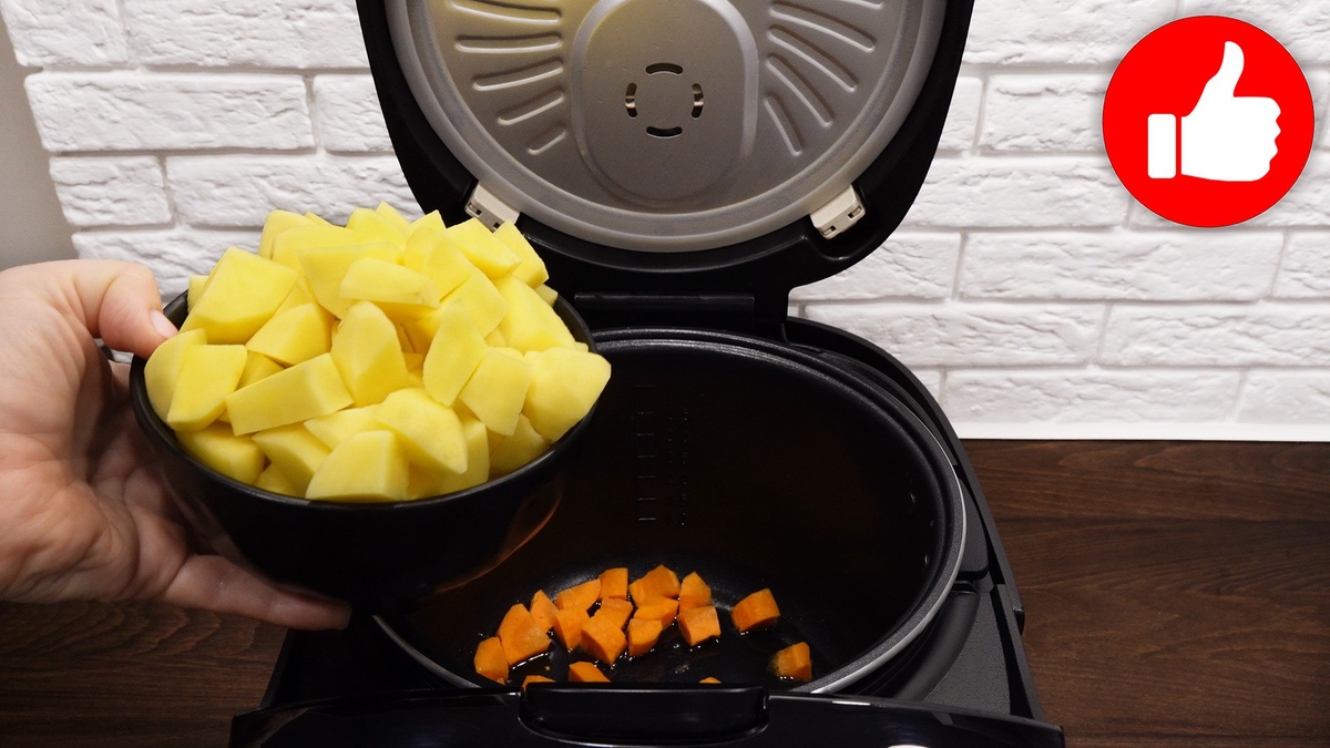 Для начала необходимо подготовить мультиварку. В чашу наливается растительное масло, чтобы избежать прилипания продуктов. Затем следует выложить нарезанную морковь, картофель и болгарский перец. После этого добавляются специи: соль, смесь перцев и сухой чеснок.